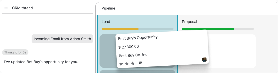 Our AI CRM software uses natural language and automation to handle the busywork for you, from creating leads to updating deal stages, so your CRM finally works for you, not the other way around.