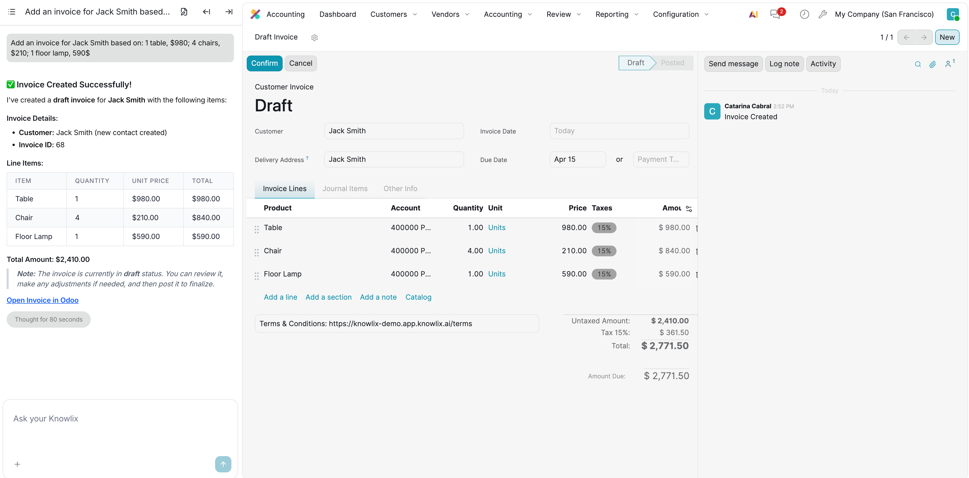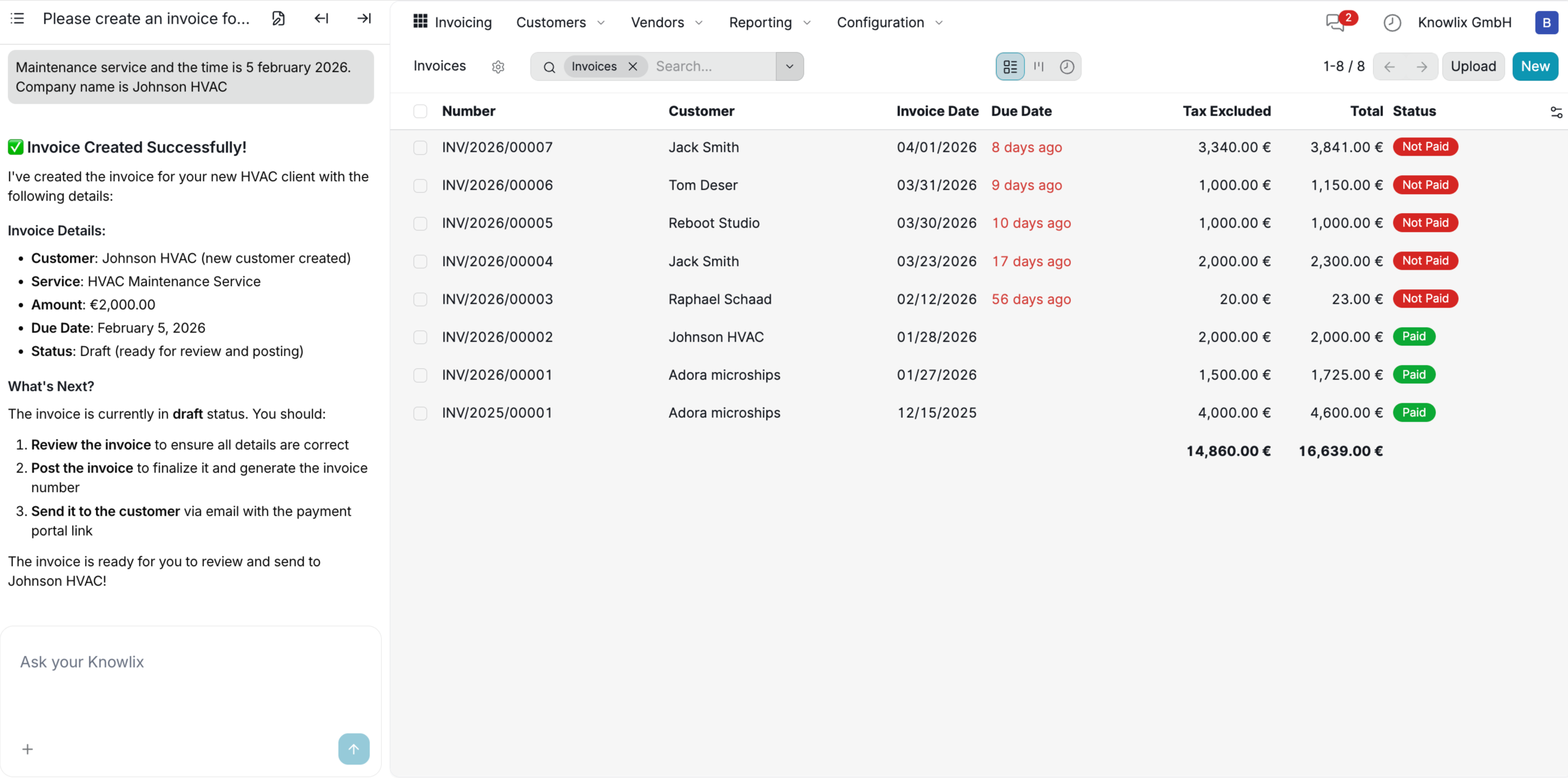 Using Ask your Knowlix, you describe the work in plain language and Knowlix creates a fully structured invoice: correct line items, payment terms, and customer details, no forms, no copy-pasting.